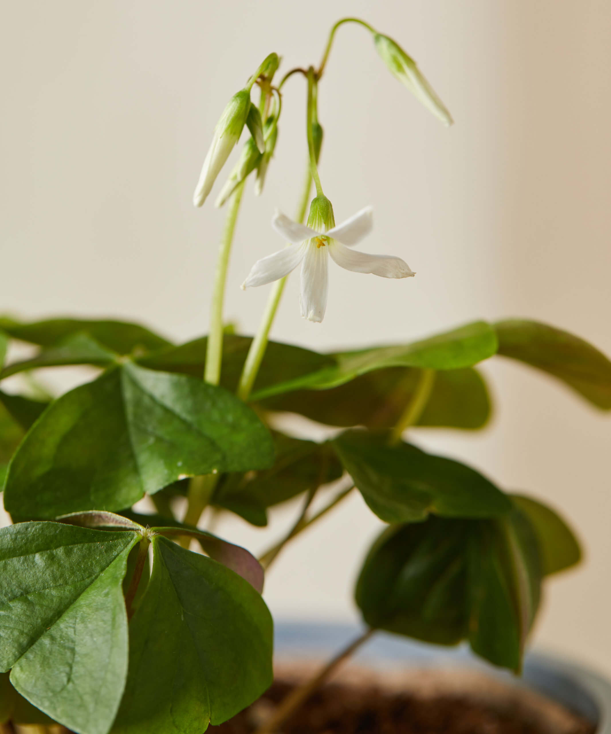 Oxalis prefers indirect to bright light while indoors, but a sudden introduction to bright light can cause the foliage to burn. If moving to a sunnier spot, acclimate the plant over a few weeks.