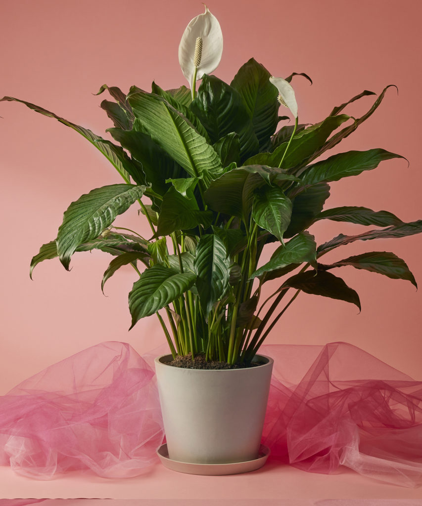 The Peace Lily is native to the dense rainforests of Venezuela and Colombia. It made its way to Europe in the 1860s and quickly gained traction for its beautiful yet forgiving nature. The plant will wilt dramatically if it gets too dry, but a thorough watering should quickly fix this. Peace lilies can adapt to low light, but provide bright indirect light to encourage the sought-after white blooms, or spathes.