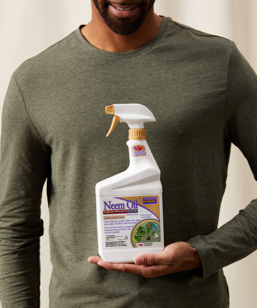 This all-purpose natural insecticide, miticide, and fungicide spray is a must-have organic gardening jack-of-all-trades treatment. It utilizes oil from the seeds of the neem tree to kill insect pests along with common fungal issues like powdery mildew, black spot, downy mildew, leaf spot, and more.
