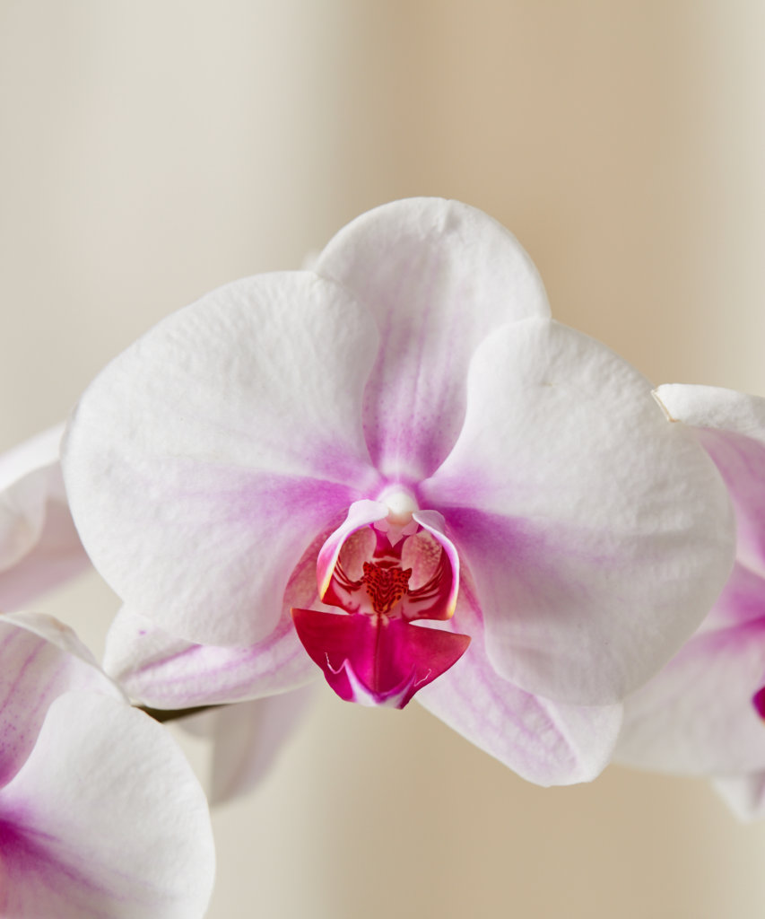 Your orchid prefers bright indirect light, such as the light from an east-facing window. Don’t let your plant sit in direct sun, which can cause the delicate foliage and flowers to burn. But on the flip side, if your orchid does not get enough light, it will not thrive and re-bloom. Grow lights are beneficial in the winter to ensure the plant receives 10-15 hours of light daily.